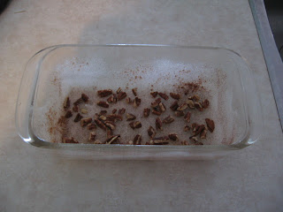 Pre heat oven to 300. Grease loaf pan. Combine 2 TBSP.sugar and 1/2 tsp. cinnamon , dust bottom and sides of loaf pan with this mixture. Sprinkle 1/4 c. pecans into bottom of pan.